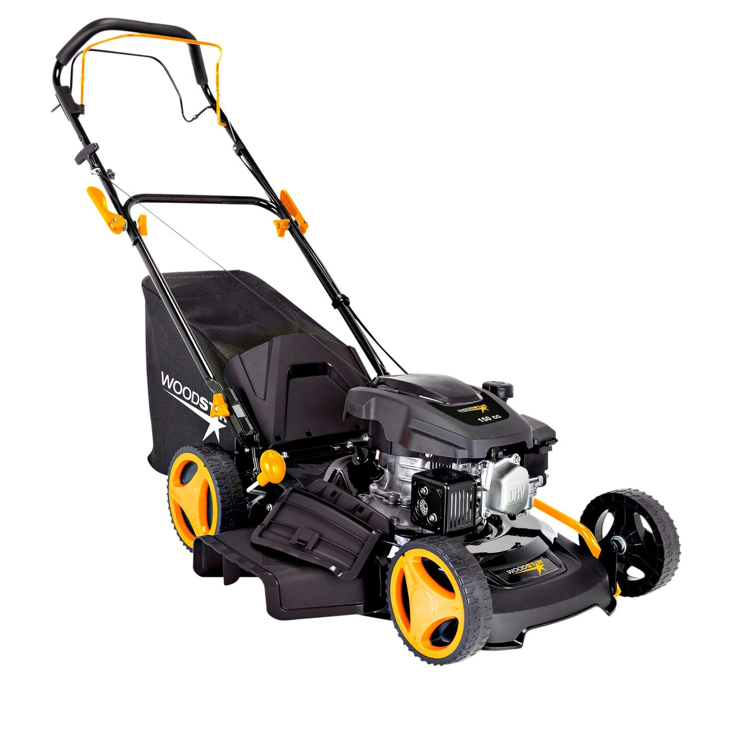 Rasenmäher der Marke Woodstar mit 46cm Schnittbreite, Mulchaufsatz und Fangkorb.