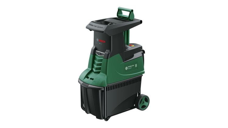 Leistungsstarker 2500W 230v Elektro-Häcksler der Marke Bosch Power Tools zum häckseln von Holz und Gartenabfällen mit Turbine-Cut-Technologie.