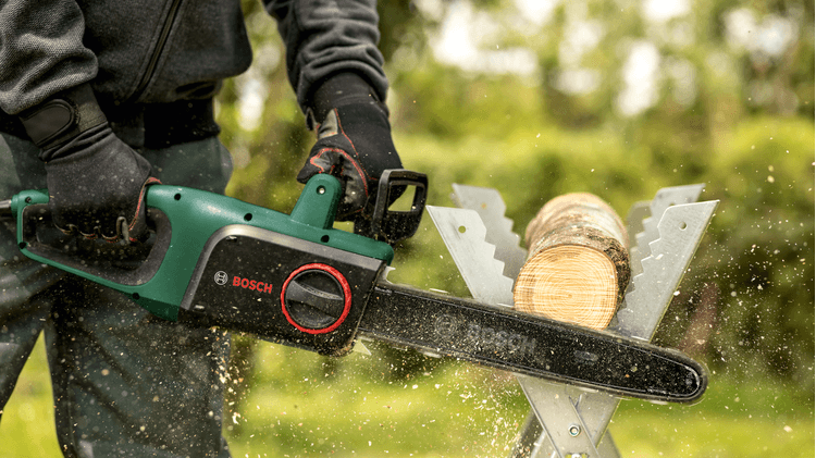 Leistungsstarke 1800W 230v Elektro-Kettensäge der Marke Bosch Power Tools mit 35cm-langer Schiene und Kette von Oregon®.